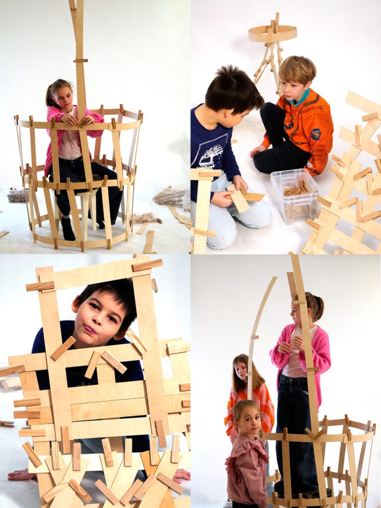 Careful handling and respectful use of the material are necessary to avoid overstressing and breaking the wooden strips. Through play, children learn about different types of wood (strips and staples) in terms of color, structure, and texture.